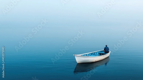© Nat_Photo_AI, Naklejka premium Serene Rowboat on Calm Waters with a Lone Fisherman at Dawn in a Misty Landscape