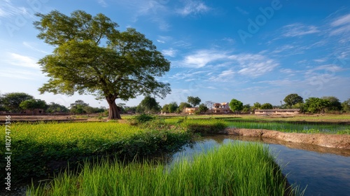 Fototapeta premium Serene Rural Landscape with Lush Green Rice Fields and Majestic Tree Under...