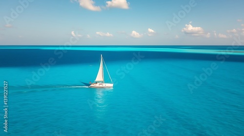 Obraz premium Serene Sail on Turquoise Waters: A lone sailboat navigates the expansive...