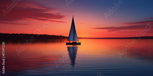 © aekkasit, Fototapeta premium Serene Sailboat Gliding Across Tranquil Lake at Twilight with Stunning Sunset Reflection