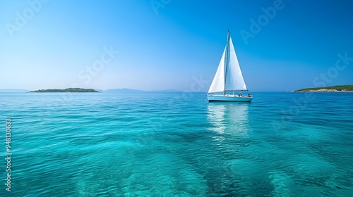 © pkproject, Obraz premium Serene Sailboat Gliding on Tranquil Turquoise Ocean with Distant Islands