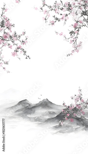 © decorator, Naklejka premium Serene sakura blossoms frame distant mountains in elegant ink wash art evoking timeless beauty