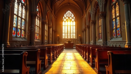 Fototapeta premium Serene Sanctuary Sunlight Illuminating Wooden Pews and Stained Glass Windows...