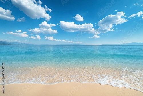 © amine, Fototapeta premium Serene sandy beach with blue waves under a bright sky.