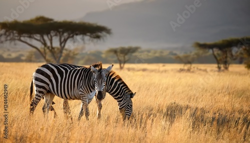 Fototapeta premium Serene Savannah Sunset Two Majestic Burchells Zebras Silhouetted against the Gilded African Sky, Amidst a Sea of Golden Grasslands.