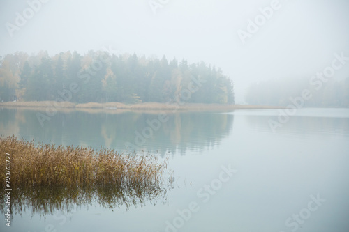 © Suzi Media , Fototapeta premium Serene Scandinavian fall landscape of Southern Finland, Espoo in foggy day. Colorful autumn forest reflecting in calm sea water. Fallen leaves on water surface and misty sea. Serene Scandinavian fall