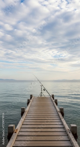 © Muhammad, Obraz premium Serene scene featuring fishing rod on a wooden pier under a cloudy sky