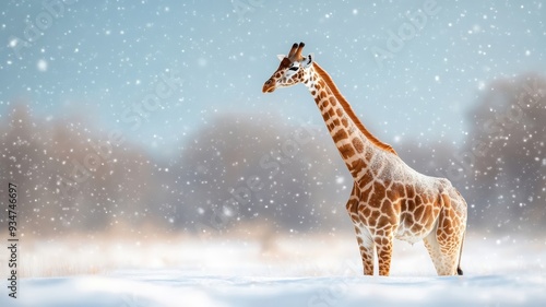 Fototapeta premium Serene scene of a giraffe moving through a snowy landscape, with snowflakes...