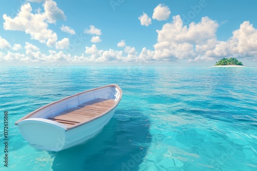 © Daria, Naklejka premium Serene scene of a white boat on clear blue water with floating clouds and a scenic island background