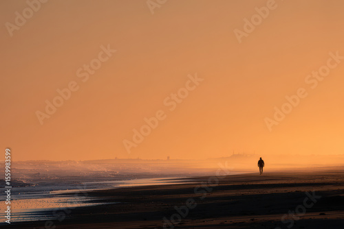 © Nemanja, Fototapeta premium serene scene of solitary figure walking along deserted beach at golden hour