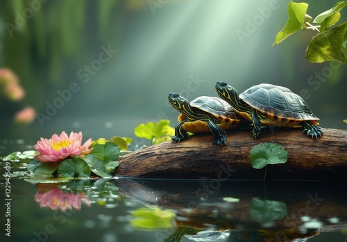 © ANUAR, Obraz premium Serene Scene of Two Turtles Relaxing on a Log Near a Vibrant Water Lily in a Peaceful Pond Illuminated by Gentle Sunlight