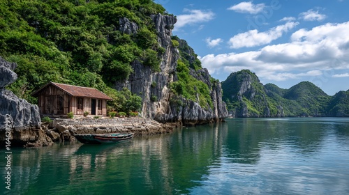 © nur khayati w, Fototapeta premium Serene scene wooden cottage nestled amidst lush green islands and calm water