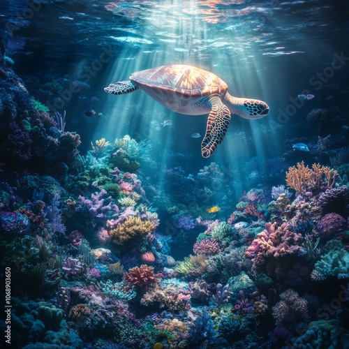 Naklejka premium Serene Sea Turtle Swimming in Coral Reef Paradise