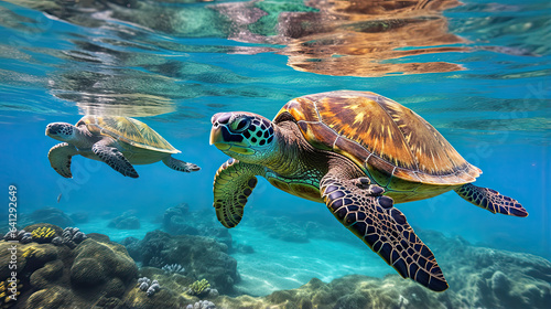 Obraz premium Serene sea turtles gracefully gliding through the crystal-blue ocean waters