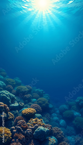 Fototapeta premium Serene Seabed: Captivating Blue Ocean Background with Sunlight and Undersea...