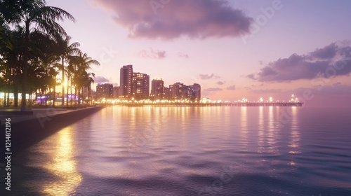Fototapeta premium Serene Seafront Cityscape with Illuminated Hotels and Palm Tree Silhouettes...