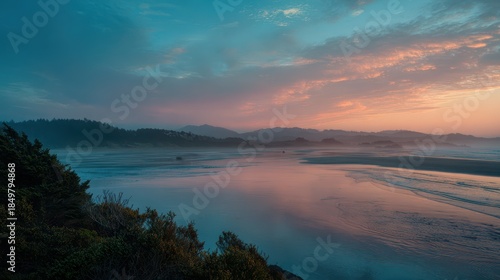 Fototapeta premium Serene seascape during golden hour with glowing horizon and blue-orange tones