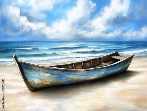 © Duskcraft, Fototapeta premium Serene Seascape Painting Blue Boat on Sandy Beach Tranquil Ocean Scene