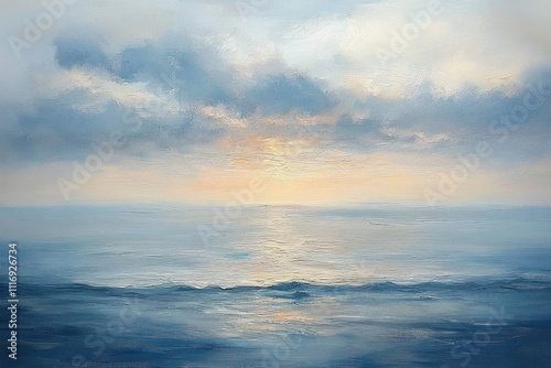 © Aleksandra, Obraz premium Serene Seascape Painting Impressionistic Style Soft Pastel Colors Sky Water Reflection