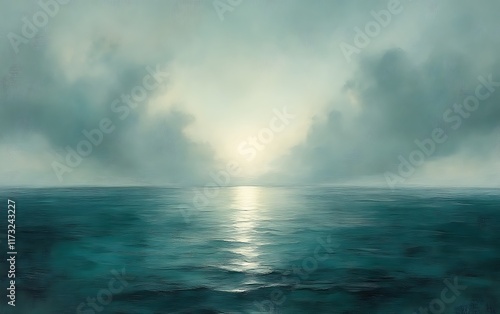 © Tahu, Obraz premium Serene seascape painting, sun peeking through clouds over calm ocean.