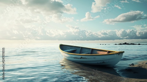 © Juan, Naklejka premium Serene seascape with a small wooden boat on calm waters