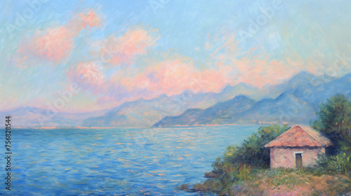 © GoonDuLagoon, Fototapeta premium Serene Seascape with Pirate Ship, Lighthouse, and Dreamy Golden Hour Glow