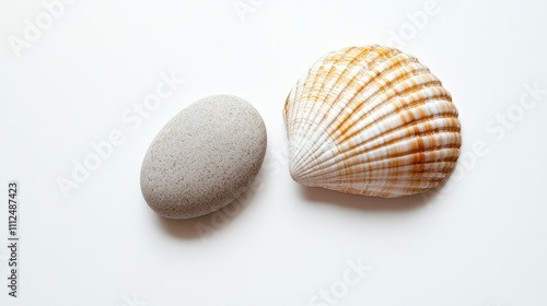 Fototapeta premium Serene Seashore: Pebble and Shell Harmony on a White Background