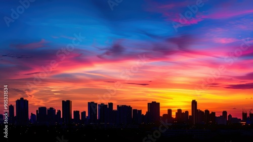 Fototapeta premium Serene Silhouette of City Skyline Against Vibrant Sunset Sky