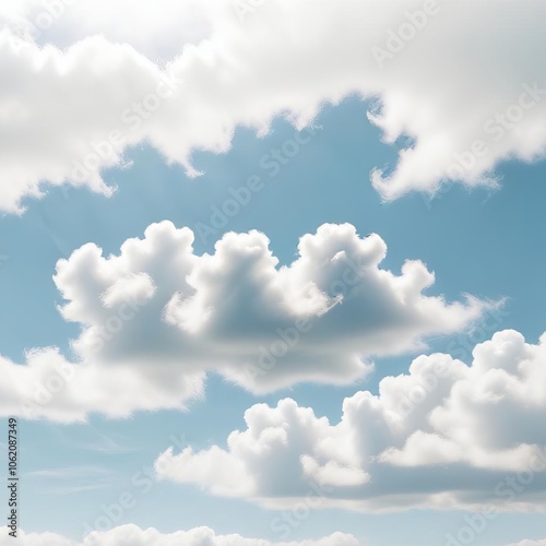 Fototapeta premium Serene Sky: A symphony of white, fluffy clouds drifts across a canvas of azure blue, evoking a sense of tranquility and peace. The soft, ethereal glow of the sun bathes the clouds in a gentle light.