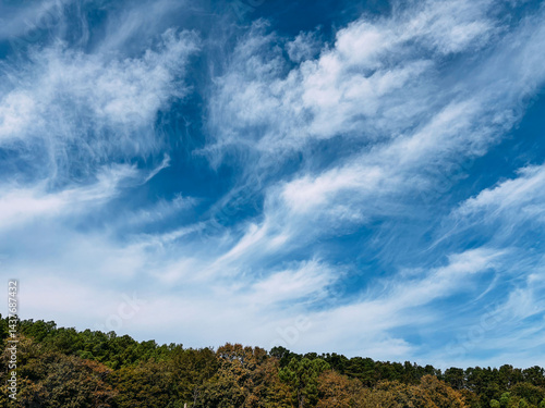 © elif, Obraz premium Serene sky with clouds over a forest landscape in bright daylight