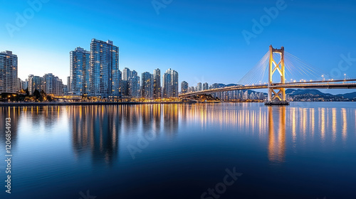 © siraphol, Naklejka premium serene skyline city at dusk with silhouette of bridge and reflections