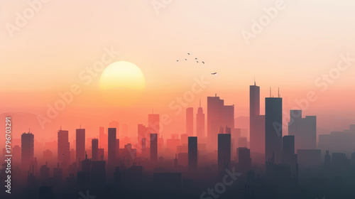 Naklejka premium Serene skyline dawn showcases minimalistic cityscape with silhouettes of skyscrapers against vibrant sunrise. warm hues evoke tranquility and hope