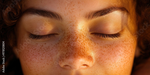 © Lila Patel, Fototapeta premium Serene Smile: A peaceful expression on a person's face, eyes slightly closed.