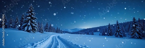 Fototapeta premium Serene snowfall blankets a quiet, snow-covered landscape under a dark, starlit night sky Perfect for winter, holiday, and nature themes Crisp, clean image , outdoors, dark, texture