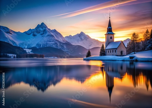Fototapeta premium Serene Snowy Church Silhouette by Calm Water, Mountain View - Winter Landscape Stock Photo