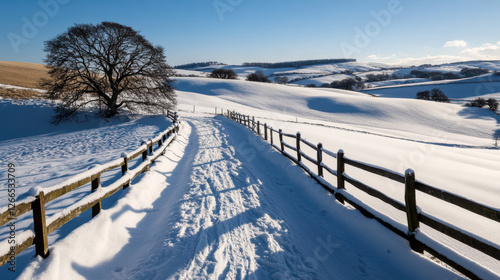 © vachiraphan, Naklejka premium serene snowy landscape with rolling hills and fence