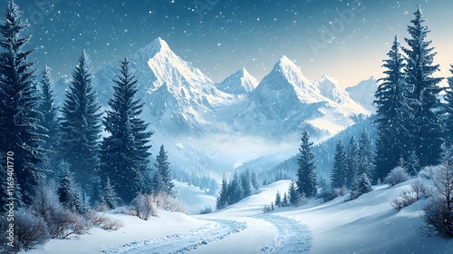 Fototapeta premium Serene Snowy Mountain Landscape with Winding Path and Evergreen Forest