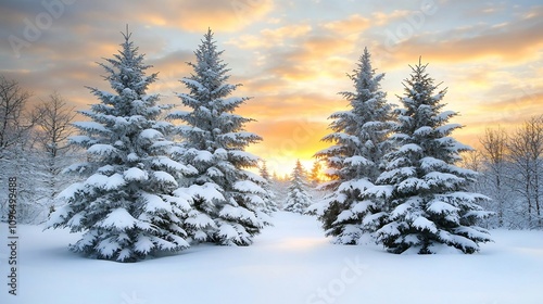 Fototapeta premium Serene Snowy Pine Forest at Sunset with Soft Golden Light