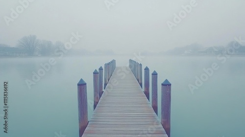 © Media Srock, Fototapeta premium Serene Solitude: A Misty Pier Overlooking a Tranquil Lake