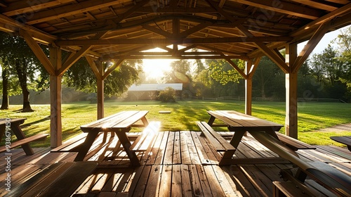 Obraz premium Serene Solitude: Sunlight Dappled on Wood Benches in an Empty Park Pavilion,...