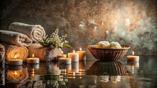 Fototapeta premium Serene Spa Setting with Rolled Towels, Candles, and Aromatic Salts in a Basket