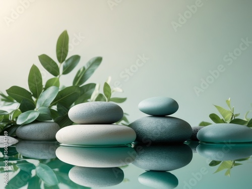 © Den Boro Day, Obraz premium Serene Spa Stones and Greenery Reflection on Teal Water