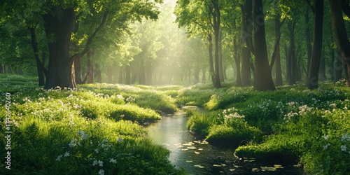 Fototapeta premium Serene Spring Forest with Sunlight and Gentle Stream