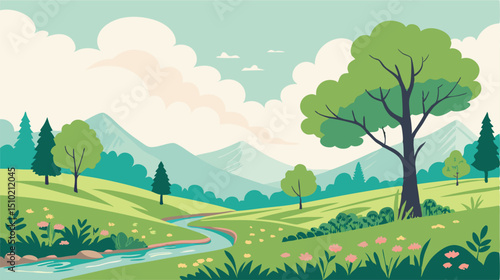 © Mohamed, Fototapeta premium Serene Spring Landscape: Green Hills, River, Mountains