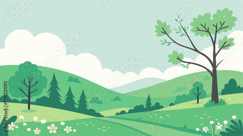 © Mohamed, Fototapeta premium Serene Spring Landscape: Green Hills, Trees, and Flowers