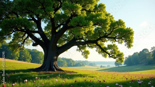 © Angel Pic, Fototapeta premium Serene Spring Landscape Majestic Tree in a Meadow of Blossoms Under a Gentle Sky
