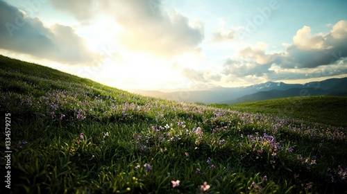 © Oat_Photo, Obraz premium Serene Spring Meadow Blooming Bluebells Mountain Vista Sunset Sky