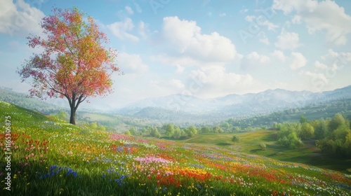 © Chom, Fototapeta premium Serene Spring Meadow Blooming Wildflowers Tree Mountains