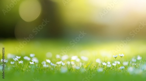 Obraz premium Serene spring meadow with blooming flowers bathed in morning light, creating...
