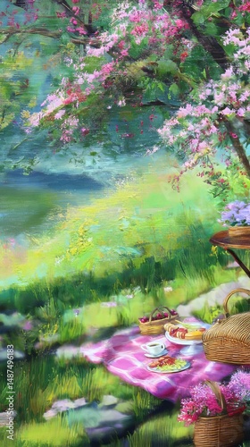Naklejka premium Serene Spring Picnic: Vibrant Outdoor Gathering Amidst Blossoming Nature